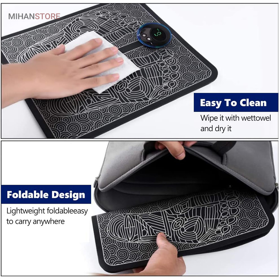 ماساژور هوشمند پا EMS Foot Massager یک پد نرم به نرمی پد یوگاست ولی بسیار باریکتر که توسط باتری موجود در کنترل آن امواج مغناطیسی را به کف پای شما میفرستد. کف پا را به تخصصی ترین شکل ممکن ماساژ میدهد. این ماساژور تاشو بسیار سبک و قابل حمل می باشد. باتری آن با کابل USB که بهمراه پد تقدیم شما میشود شارژ میشود. این پد که از جنس پد یوگاست به راحتی با دستمالی نم دار و به راحتی قابل تمیز شدن است. با کمک این پد بی صدا به آرامشی بی نظیر در کف پای خود خواهید رسید. چرا که این پد از کف پا با به گردش در آوردن خون در رگها و به حرکت در آوردن عصب ها پای شما را تا قسمت ران ها ماساژ خواهد داد. ماهیچه های خواب رفته و ضعیف را قوت میبخشد.برای برآوردن نیازهای مختلف ماساژ، تکنیکهای شبیهسازی هوشمند ماساژ مصنوعی با توجه به ترجیحات شخصی و استرس فیزیکی، میتوانند آزادانه از درجات شدت مختلف و حالت های مختلف به دلخواه انتخاب و تنظیم کنید.برعکس برخی ماساژور سنتی پا که وزن سنگینی دارند، این محصول فقط یک پد نرم و راحت برای پا است. سبک و تاشو با امکان حمل آسان در هر مکانی است. این ماساژور پا از مواد نرم مناسب یوگا و سطح چرمی ساخته شده است و با استفاده از حوله مرطوب قابل خشک شدن است. کاملا بی صدا است می توانید هنگام تماشای تلویزیون، مطالعه، کار در دفتر یا استراحت از آن استفاده کنید.با تکنولوژی EMS،گردش خون را در پاها و ساق پا بهبود می بخشد.بر خلاف ماساژورهای معمولی پا، ماساژور پا EMS بسیار ملایم است و برای انواع پوست مناسب است.این دستگاه برای افرادی که به باشگاه می روند، افرادی که مسافت های طولانی را طی می کنند، افرادی که اغلب دوچرخه سواری می کنند، می رقصند، از کوه ها بالا می روند و افرادی که دوست دارند کفش پاشنه بلند بپوشند، مناسب می باشد. همچنین برای مسافران، افراد میانسال و سالخورده، افرادی که دارای شغل اداری هستند مناسب است. ماساژ منظم پا به شما کمک می کند تا با خستگی های روزانه خود مقابله کنید. این دستگاه پاهای شما را در یک روز پر کار آرام کرده و خستگی انباشته را از بین می برد. ماساژور الکتریکی پا با ورود پالس ها به زیر غشاء پوستی خطوط عصبی را تحریک می کنند تا به طور خودکار با هم تعامل کنند و آرامش را به پا های شما بازگرداند.